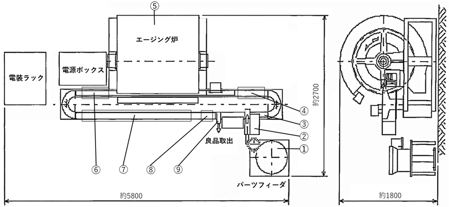 効率の良いドラム型のエージング炉を採用し大サイズの中高圧品に対応したエージング付自動選別機。